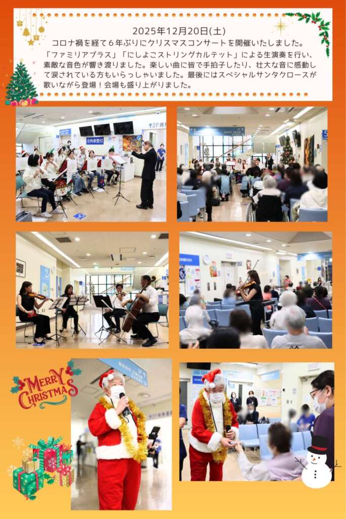 毎年クリスマスの季節に地域にゆかりのある学生やプロの演奏者をお招きし、当院外来フロアにてコンサートを開催しております。