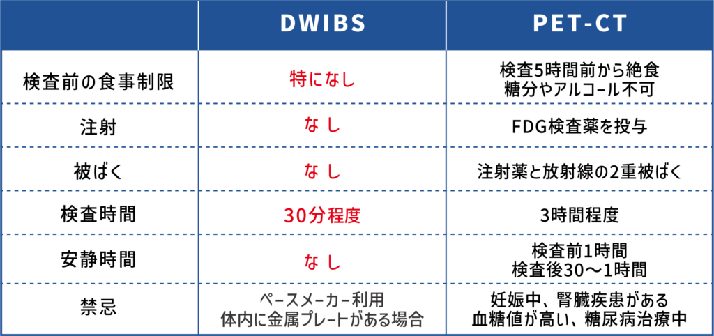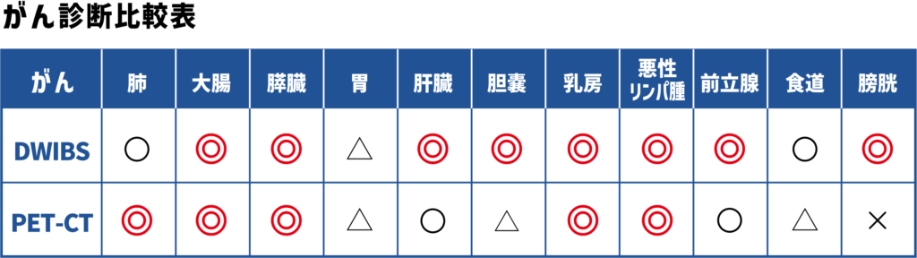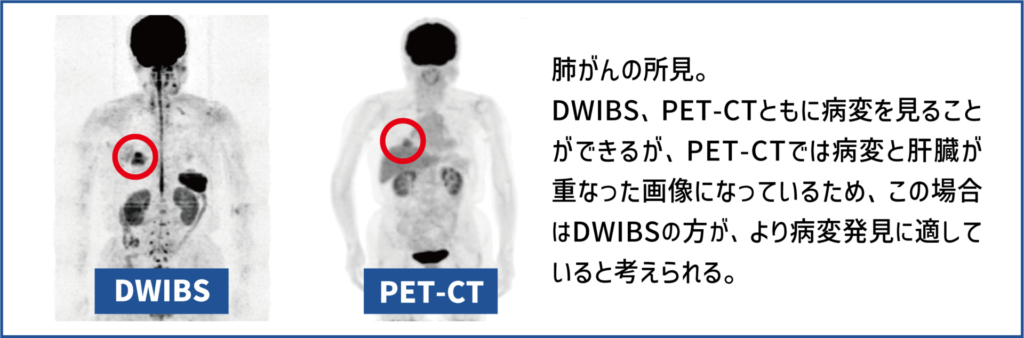 DWIBS(ドゥイブス)検査はMRIで行うため、PET-CTと違い、放射線被ばくがなく、短時間で終了するなど、患者さんの身体的負担を減らしながら、がん発見に寄与します。