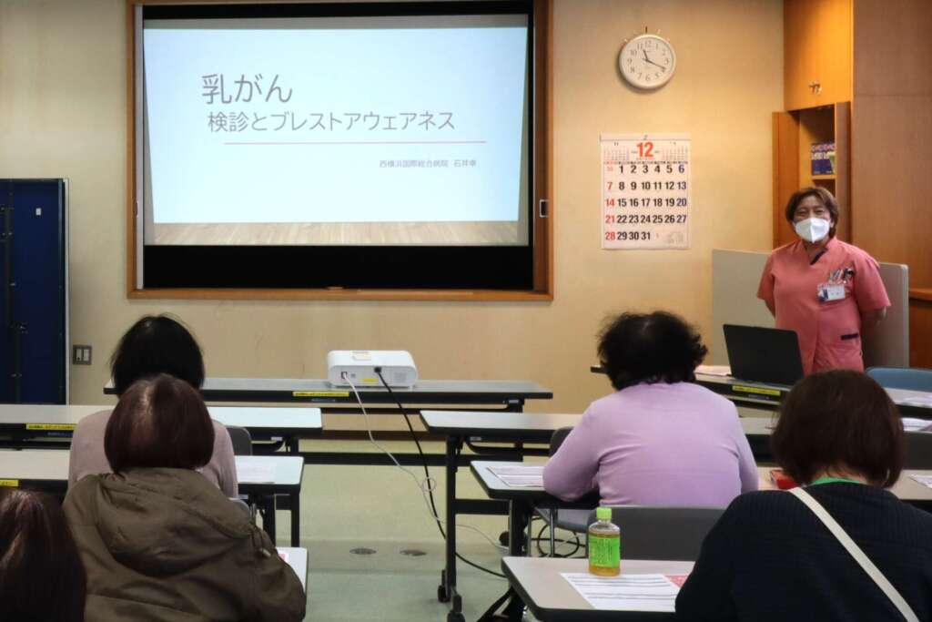 お声がけをいただき、2025/12/21(日)原宿地域ケアプラザにて大正地区保健活動推進員さん対象に、当院 外来 石井主任看護師(ピンクリボンアドバイザー)が「乳がん ~検診とブレストアウェアネス~」をテーマに講演、18名の方が参加されました。早期発見に重要だと認識されているものの痛みから敬遠されがちなマンモグラフィー検査について、撮影時の痛みを少しでも減らすための「筋膜運動」についてお話した際には、皆さん自ら取り組んでおられました。