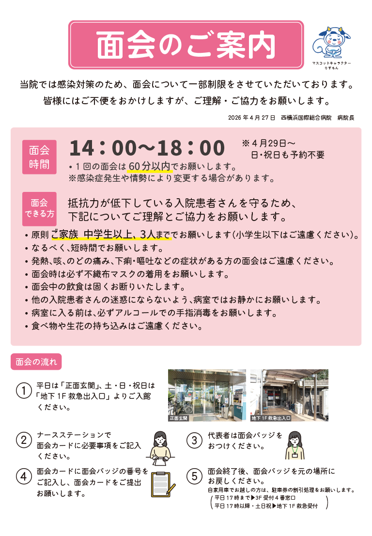 ※患者さんの病状や院内・地域の感染状況により、面会を制限させていただく場合がございます。