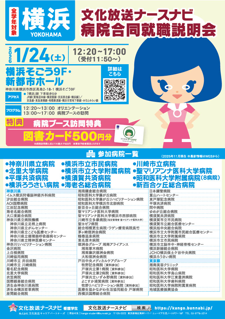 看護部の合同就職説明会を2026年1月24日(土)に横浜で予定しております。